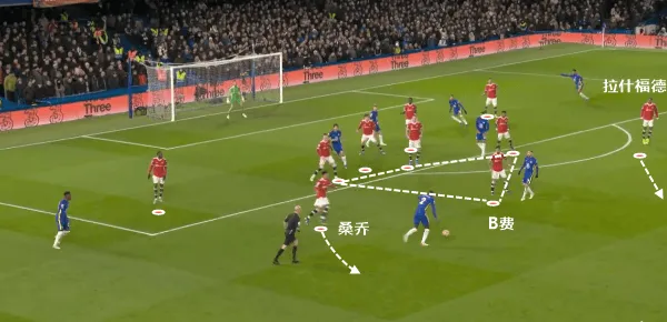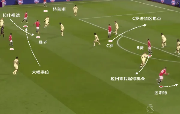 曼城在防守端需要注意曼联球员在强侧持球的同时,弱侧突然无球人高速套上外线(比如图上的达洛特)。